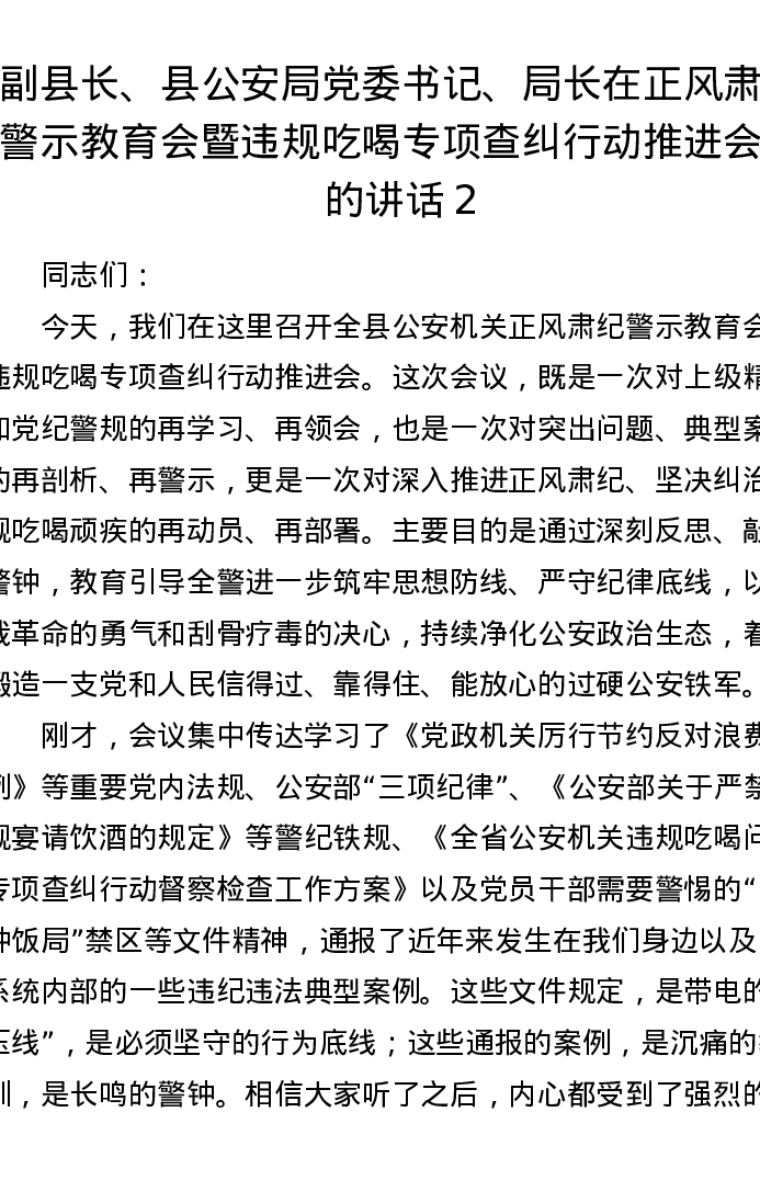 副县长、县公安局党委书记、局长在正风肃纪警示教育会暨违规吃喝专项查纠行动推进会上的讲话2