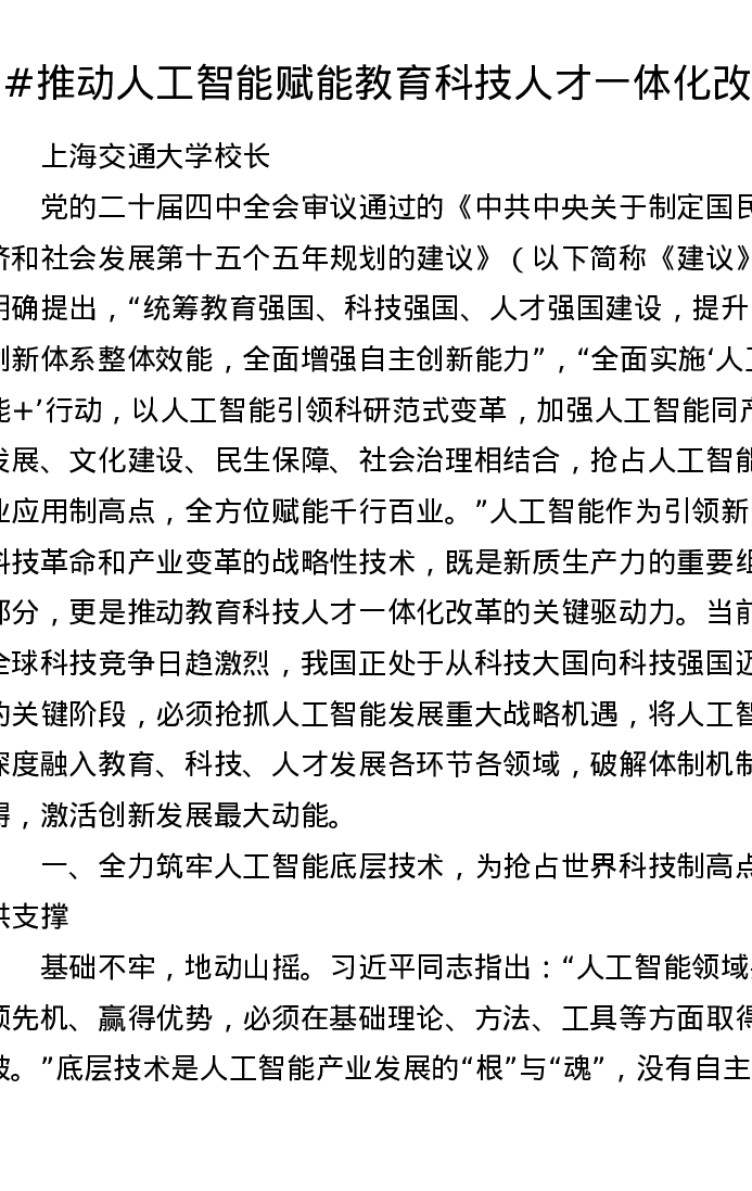 高校贯彻二十届四中全会精神讲话:推动人工智能赋能教育科技人才一体化改革
