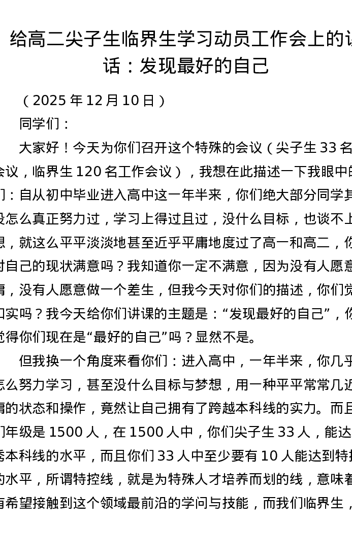 给高二尖子生临界生学习动员工作会上的讲话:发现最好的自己
