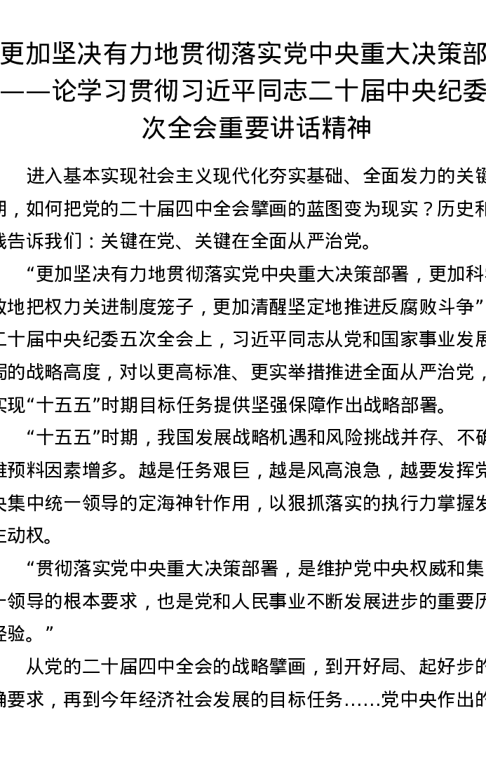更加坚决有力地贯彻落实党中央重大决策部署——论学习贯彻总书记二十届中央纪委五次全会重要讲话精神