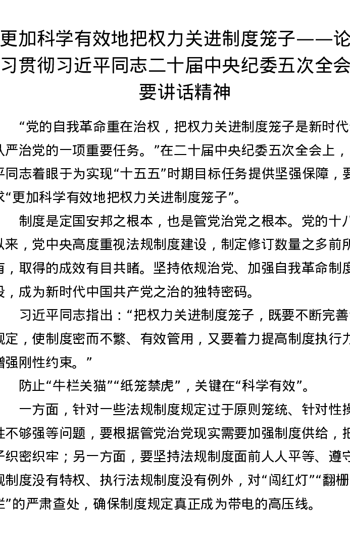 更加科学有效地把权力关进制度笼子——论学习贯彻总书记二十届中央纪委五次全会重要讲话精神
