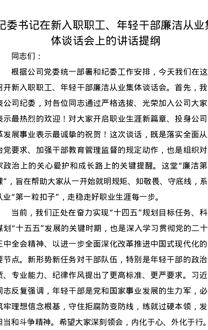 纪委书记在新入职职工、年轻干部廉洁从业集体谈话会上的讲话提纲