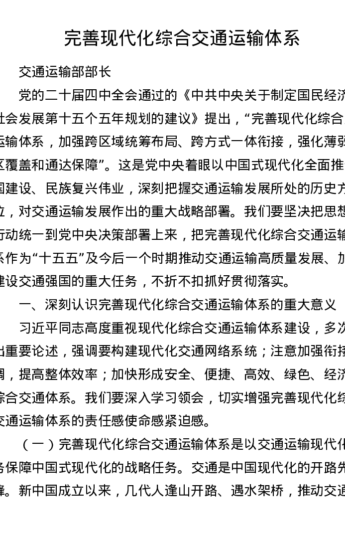 交通部贯彻二十届四中全会精神讲话:完善现代化综合交通运输体系