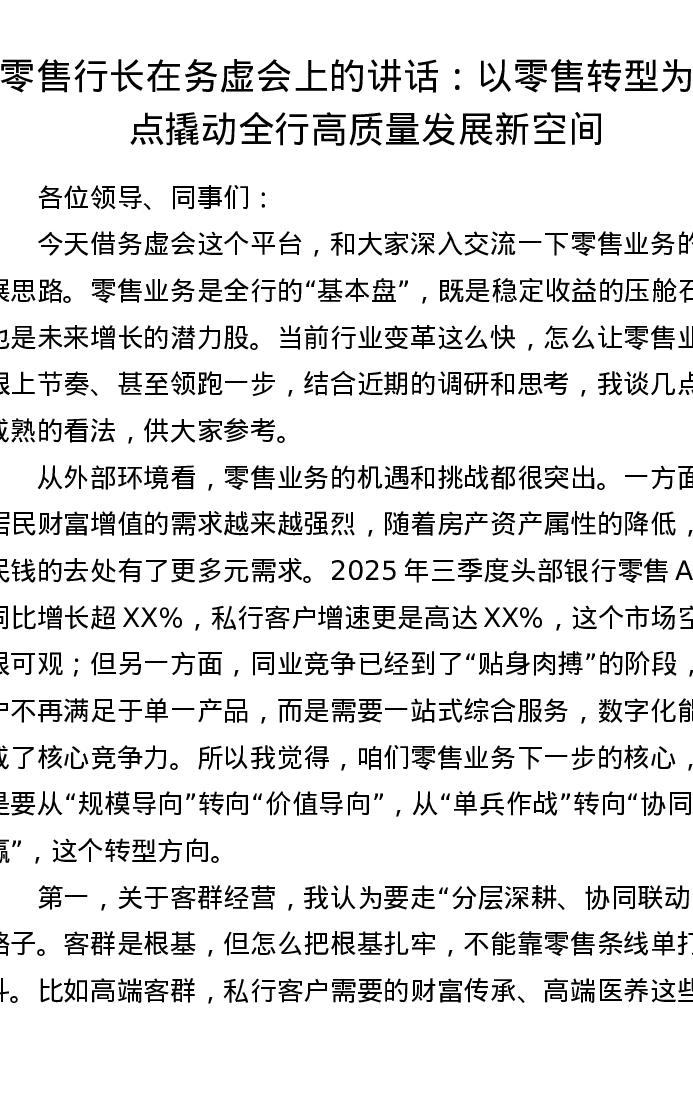 零售行长在务虚会上的讲话:以零售转型为支点 撬动全行高质量发展新空间
