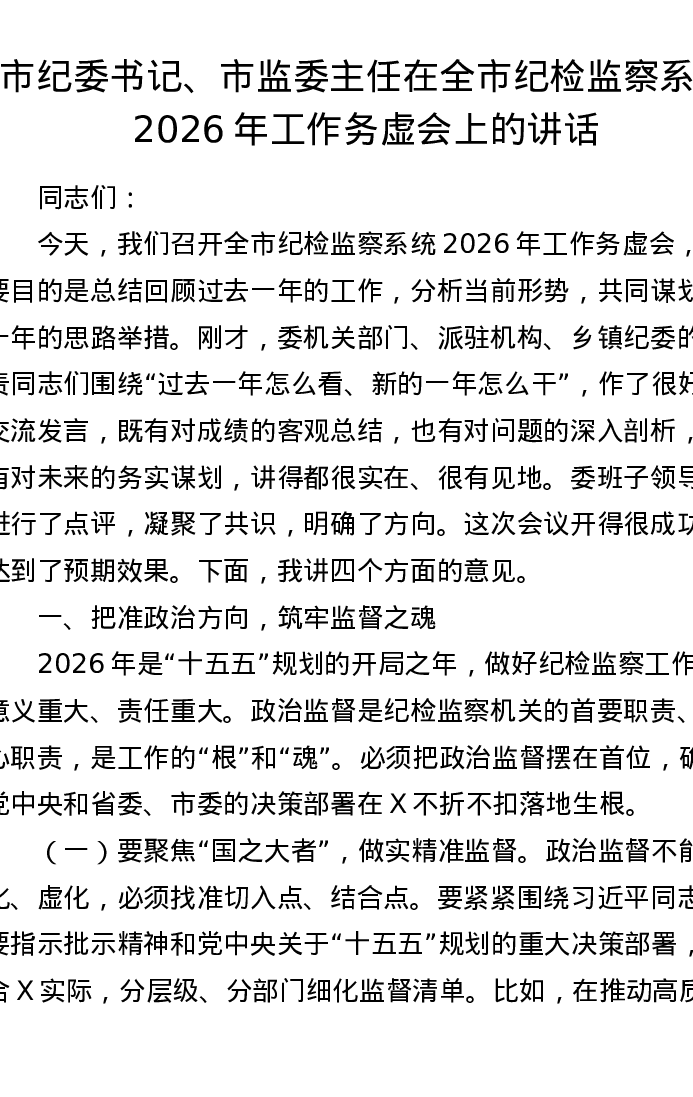 市纪委书记、市监委主任在全市纪检监察系统2026年工作务虚会上的讲话