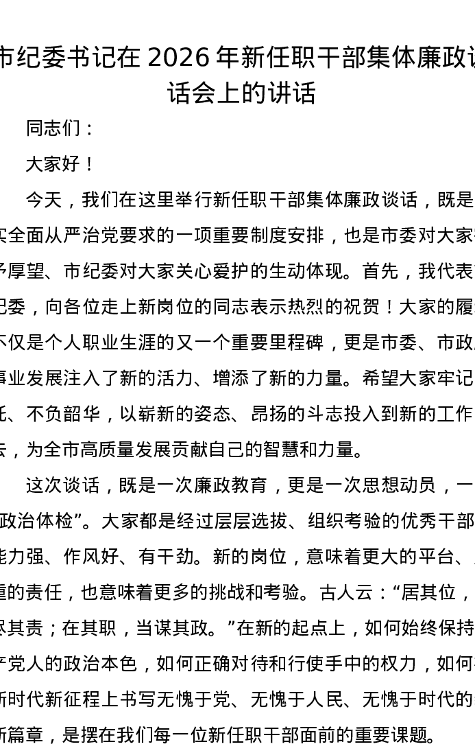 市纪委书记在2026年新任职干部集体廉政谈话会上的讲话