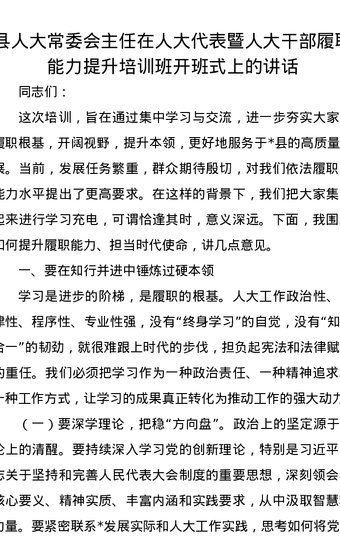 县人大常委会主任在人大代表暨人大干部履职能力提升培训班开班式上的讲话