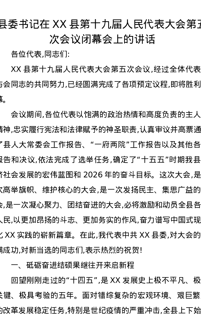 县委书记在XX县第十九届人民代表大会第五次会议闭幕会上的讲话