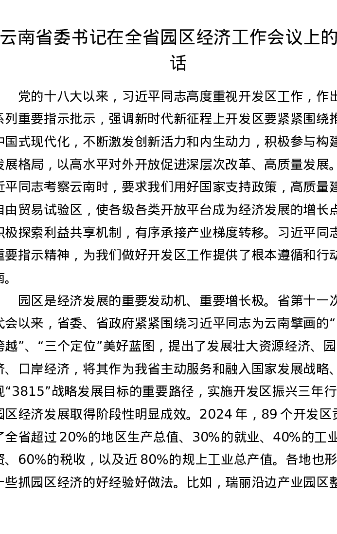 云南省委书记在全省园区经济工作会议上的讲话