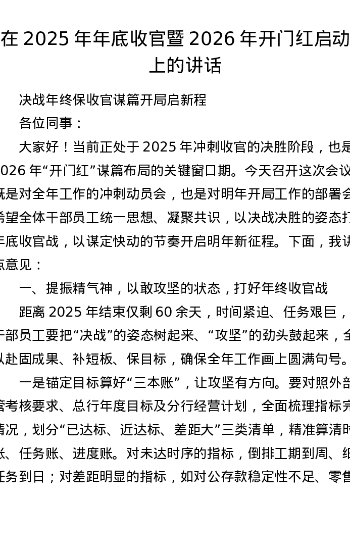 在 2025 年年底收官暨 2026 年开门红启动会上的讲话(银行)