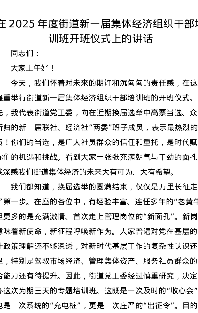 在2025年度街道新一届集体经济组织干部培训班开班仪式上的讲话