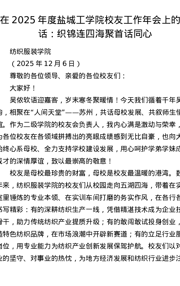 在2025年度盐城工学院校友工作年会上的讲话:织锦连四海聚首话同心