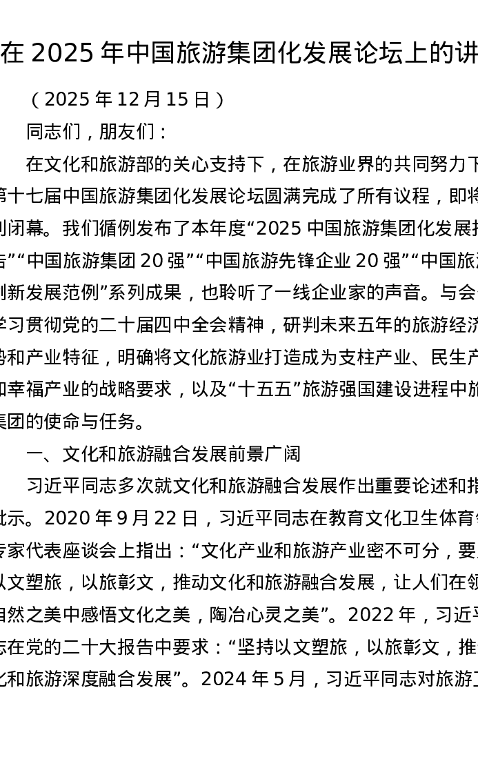 在2025年中国旅游集团化发展论坛上的讲话