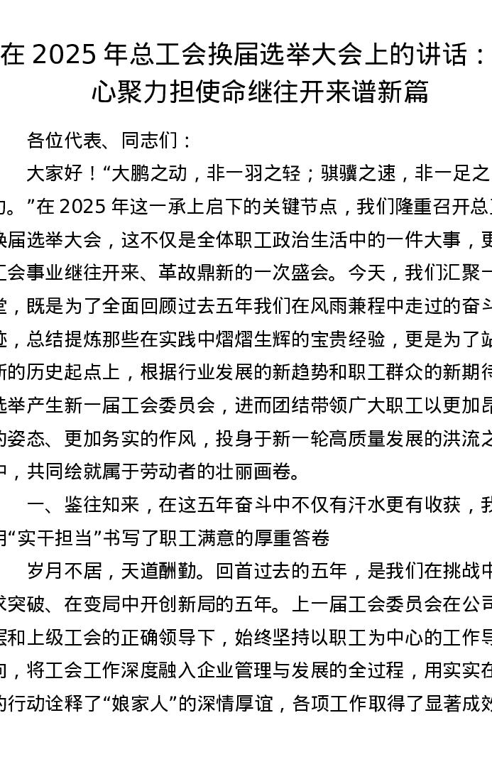 在2025年总工会换届选举大会上的讲话:凝心聚力担使命 继往开来谱新篇