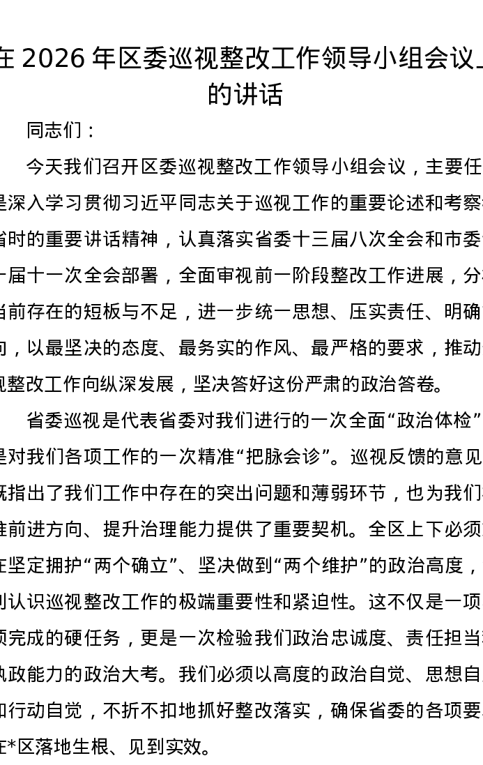 在2026年区委巡视整改工作领导小组会议上的讲话