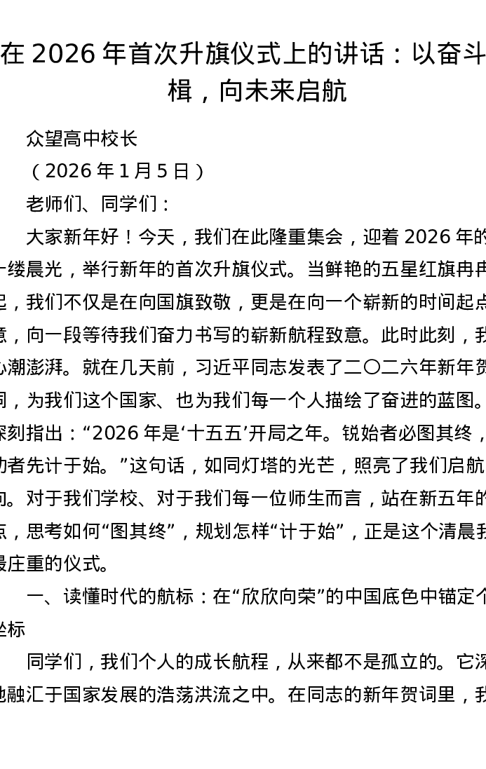 在2026年首次升旗仪式上的讲话:以奋斗为楫,向未来启航