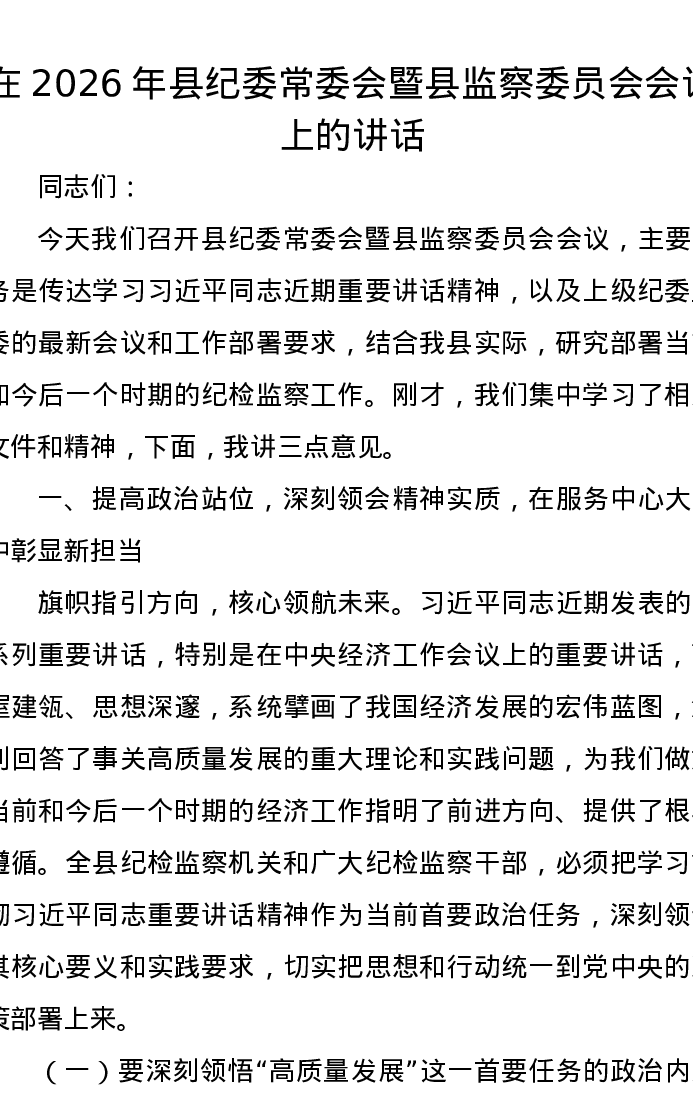 在2026年县纪委常委会暨县监察委员会会议上的讲话