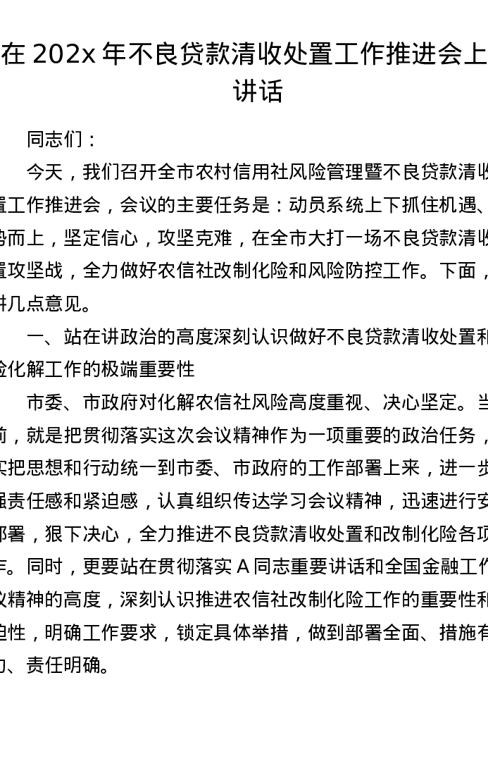 在202x年不良贷款清收处置工作推进会上的讲话