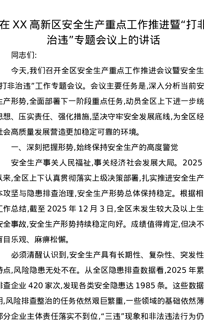 在XX高新区安全生产重点工作推进暨打非治违专题会议上的讲话