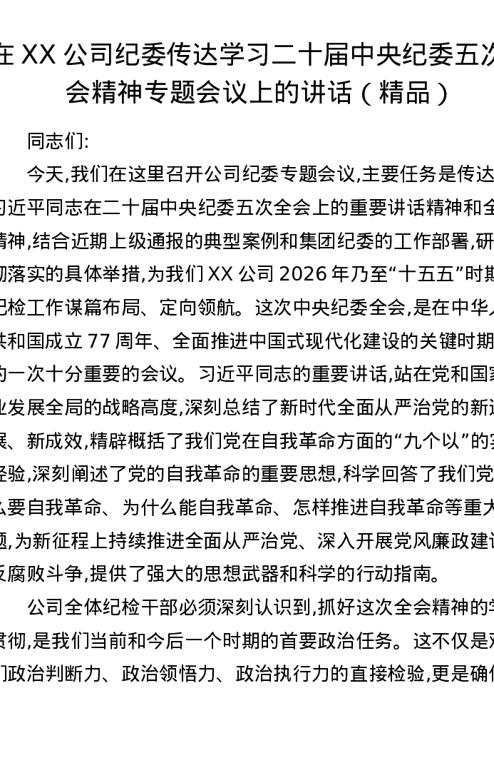 在XX公司纪委传达学习二十届中央纪委五次全会精神专题会议上的讲话