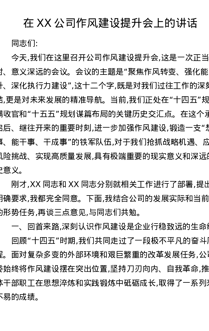 在XX公司作风建设提升会上的讲话