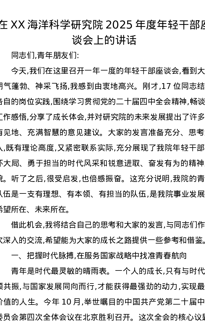 在XX海洋科学研究院2025年度年轻干部座谈会上的讲话