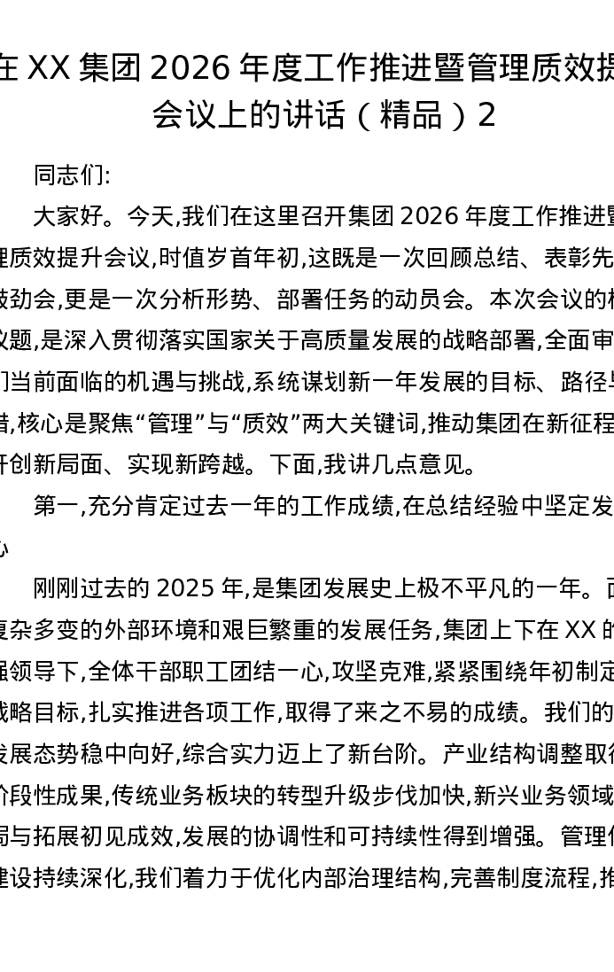 在XX集团2026年度工作推进暨管理质效提升会议上的讲话2