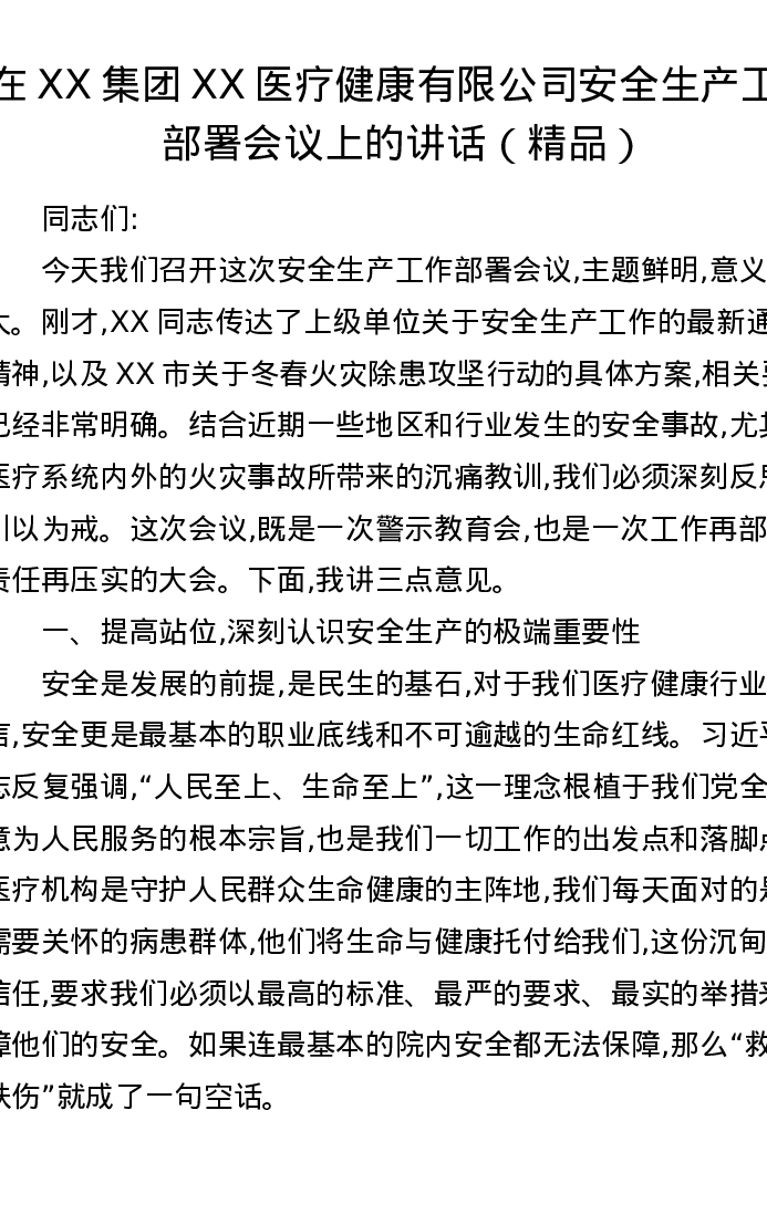 在XX集团XX医疗健康有限公司安全生产工作部署会议上的讲话
