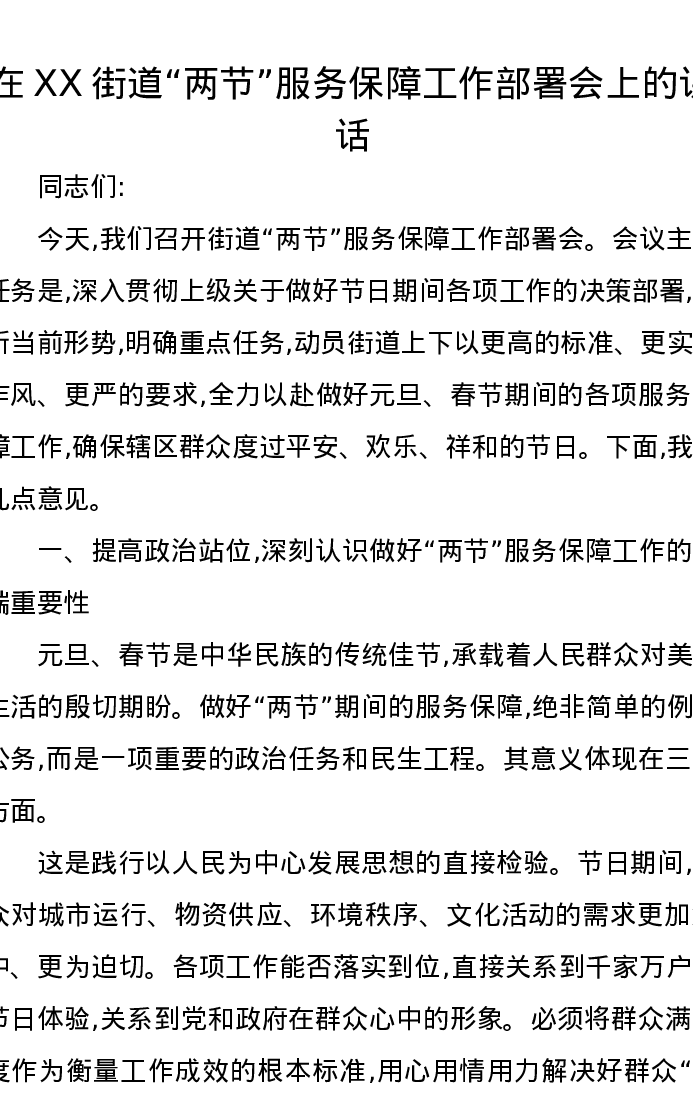 在XX街道两节服务保障工作部署会上的讲话