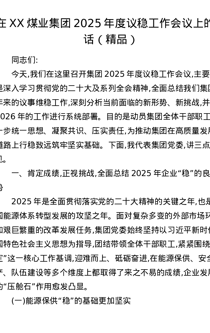 在XX煤业集团2025年度议稳工作会议上的讲话