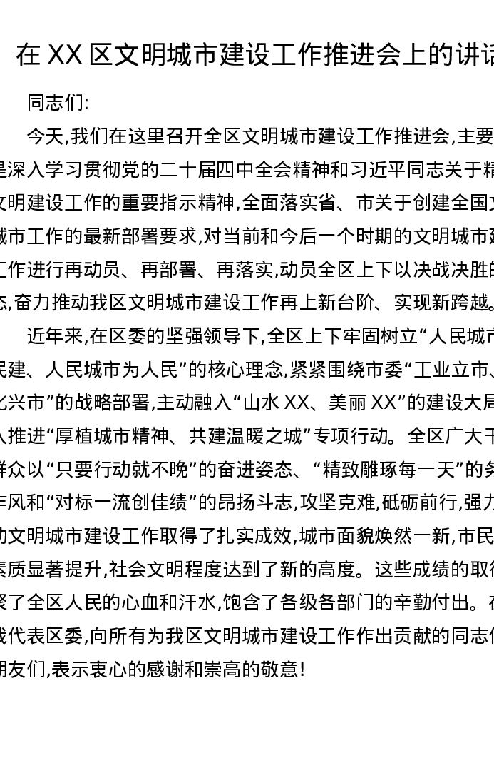 在XX区文明城市建设工作推进会上的讲话