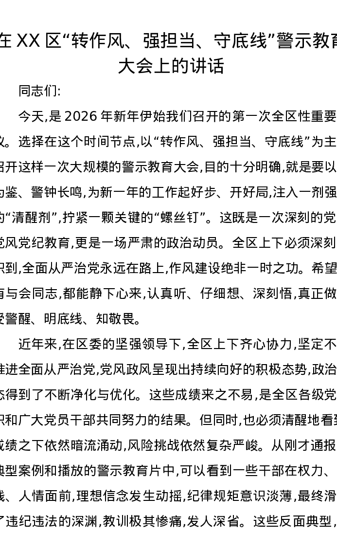 在XX区转作风、强担当、守底线警示教育大会上的讲话