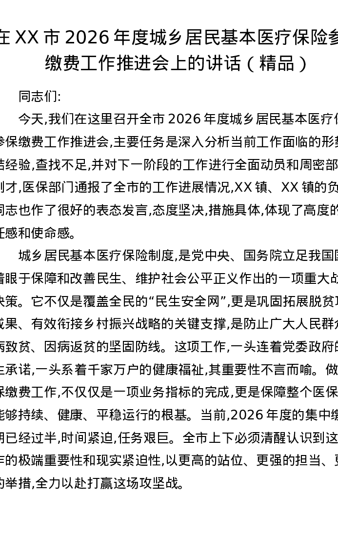 在XX市2026年度城乡居民基本医疗保险参保缴费工作推进会上的讲话