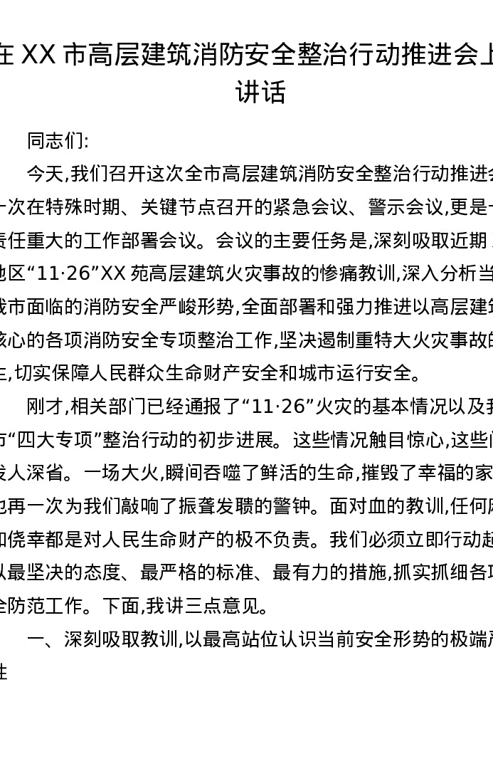 在XX市高层建筑消防安全整治行动推进会上的讲话
