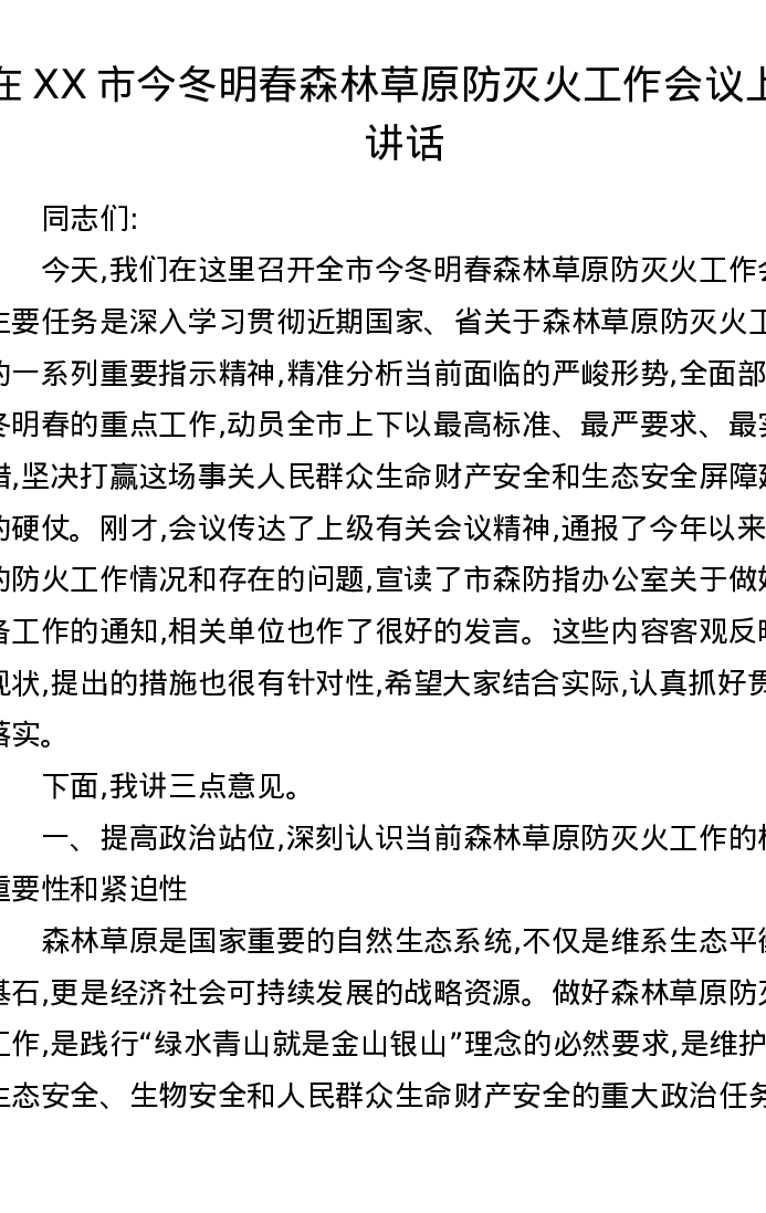 在XX市今冬明春森林草原防灭火工作会议上的讲话