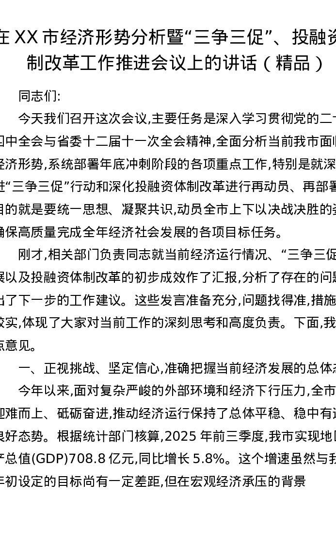 在XX市经济形势分析暨三争三促、投融资体制改革工作推进会议上的讲话