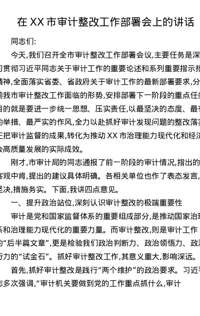 在XX市审计整改工作部署会上的讲话