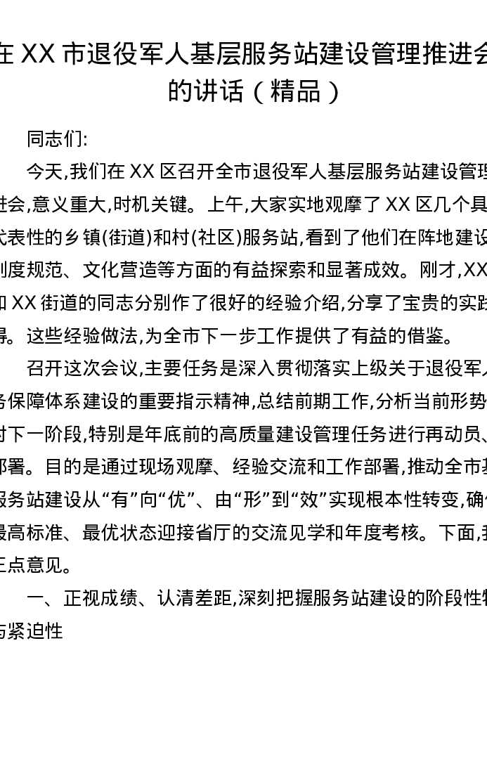 在XX市退役军人基层服务站建设管理推进会上的讲话