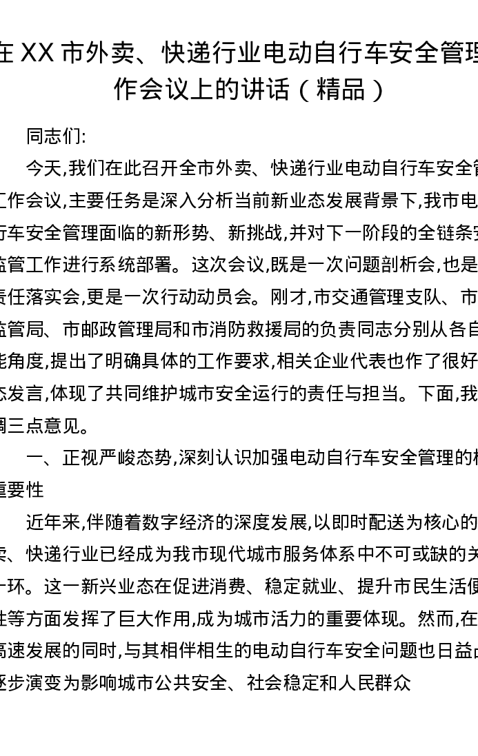 在XX市外卖、快递行业电动自行车安全管理工作会议上的讲话