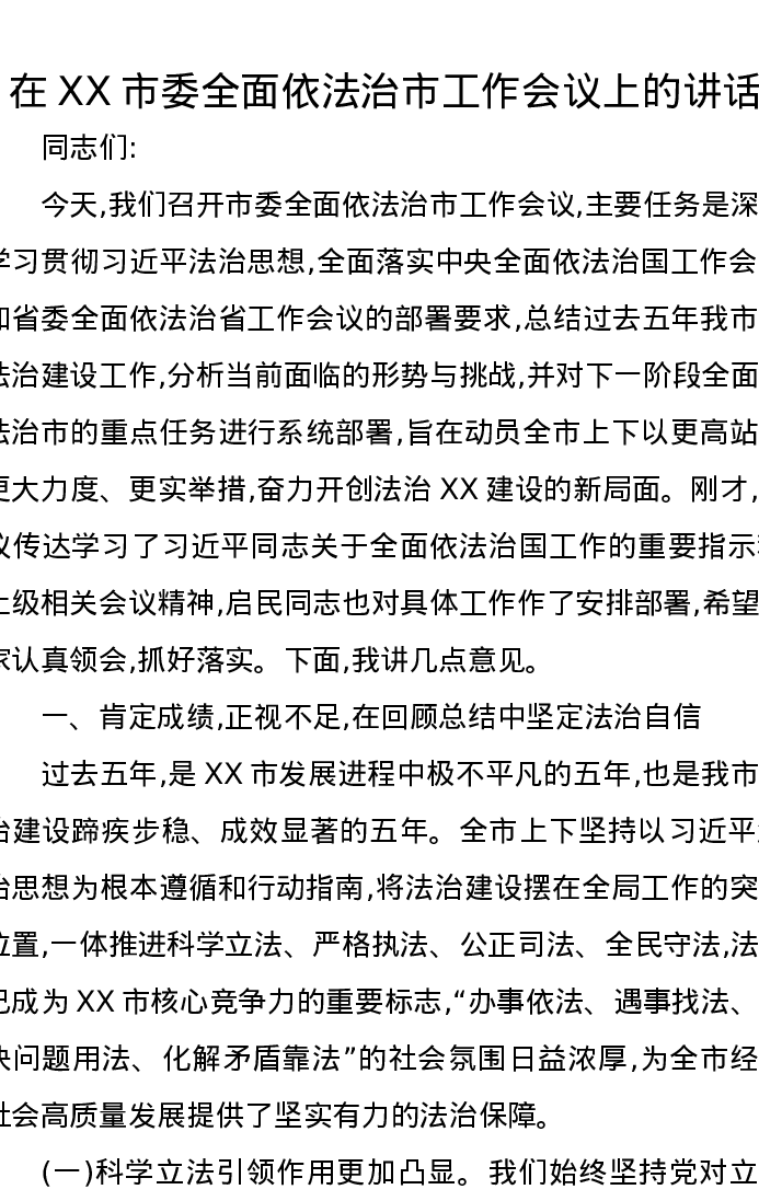 在XX市委全面依法治市工作会议上的讲话2