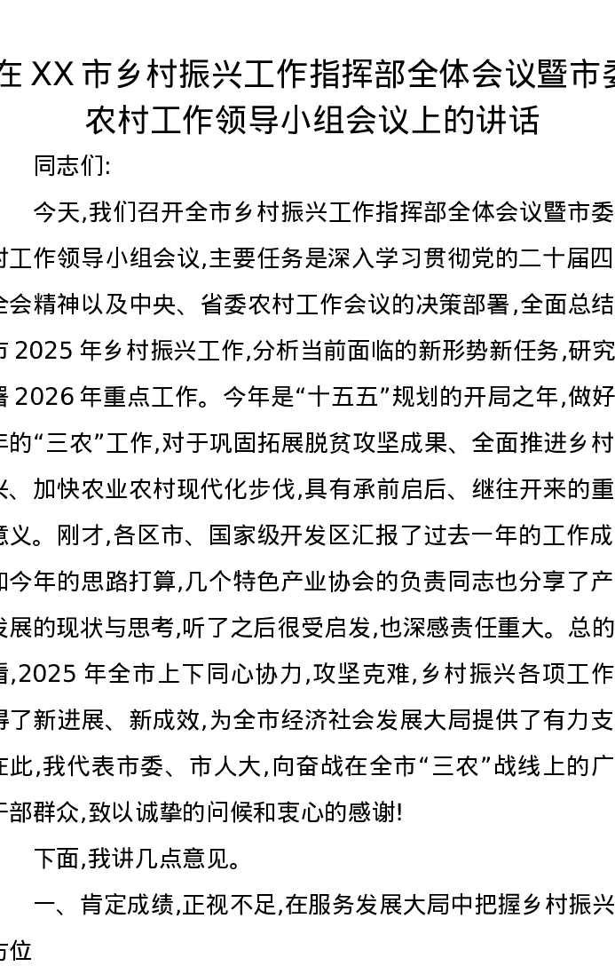 在XX市乡村振兴工作指挥部全体会议暨市委农村工作领导小组会议上的讲话
