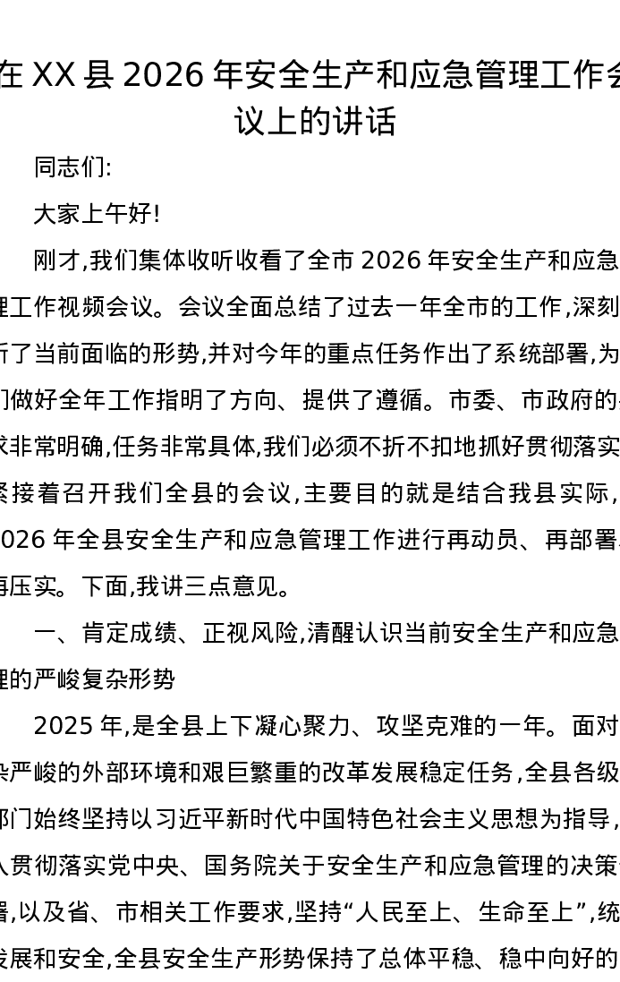 在XX县2026年安全生产和应急管理工作会议上的讲话