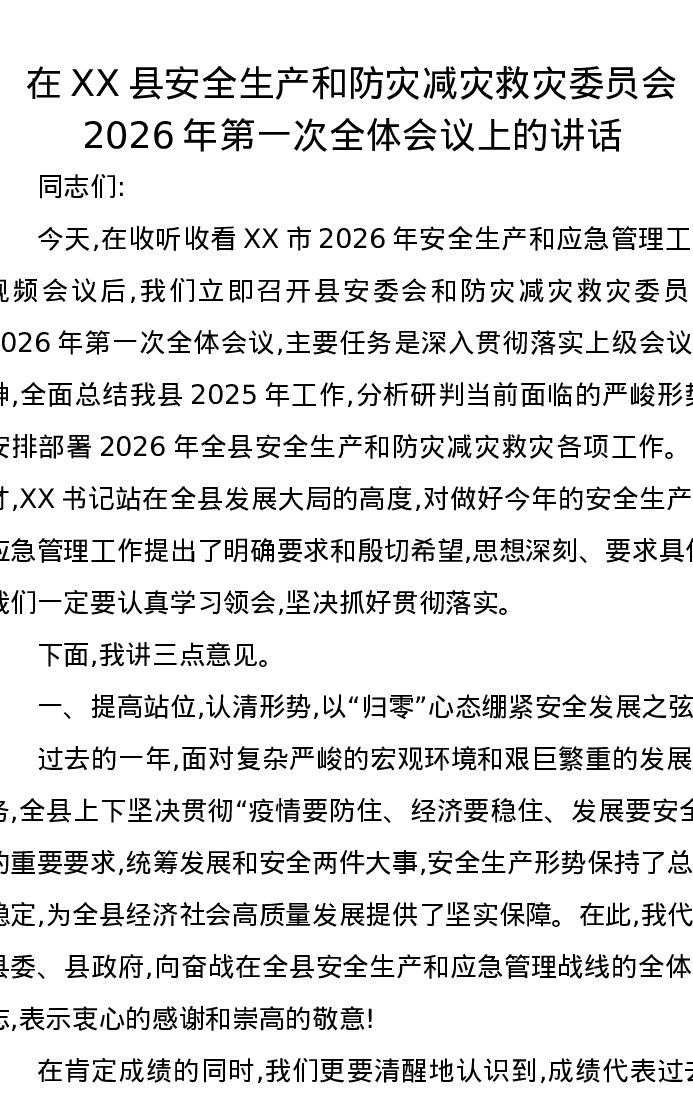 在XX县安全生产和防灾减灾救灾委员会2026年第一次全体会议上的讲话