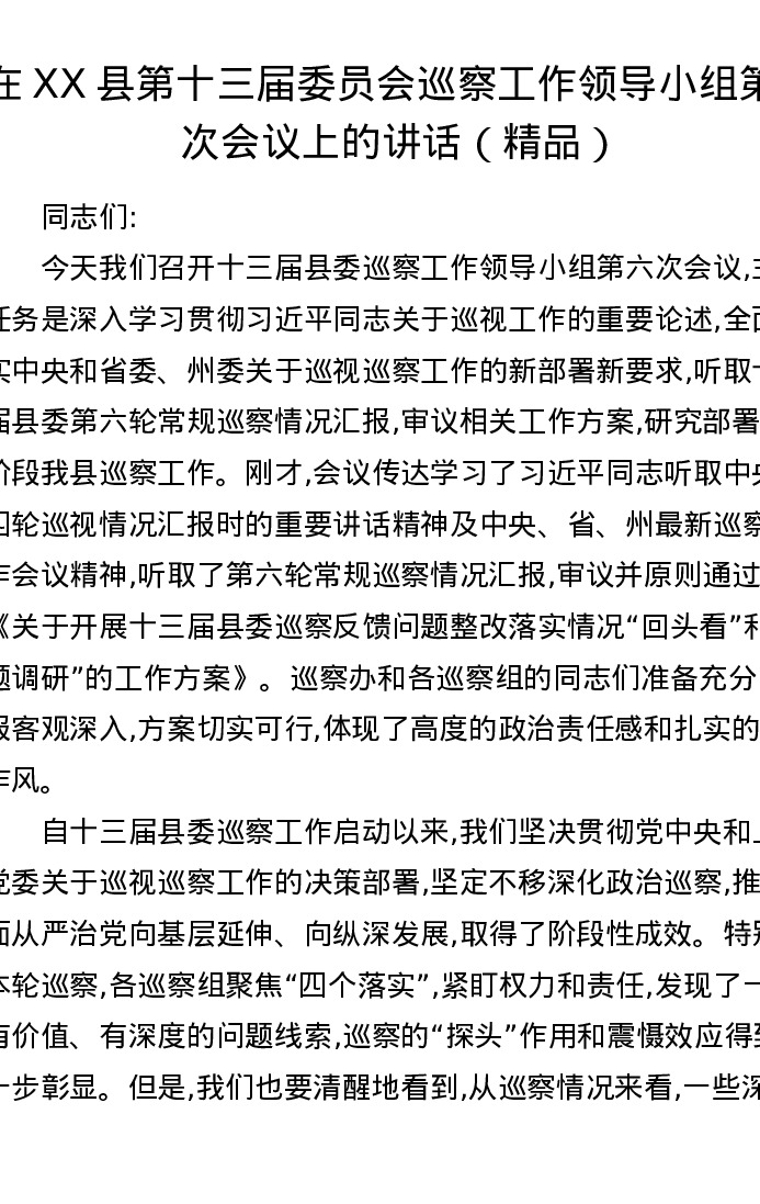 在XX县第十三届委员会巡察工作领导小组第六次会议上的讲话