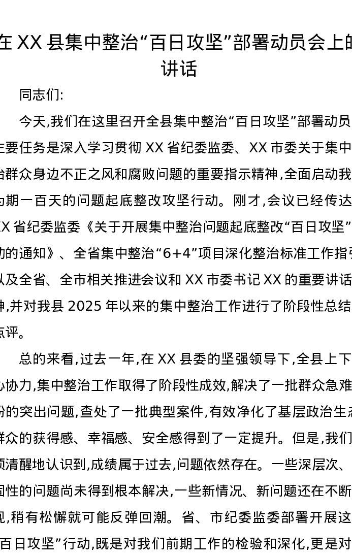 在XX县集中整治百日攻坚部署动员会上的讲话