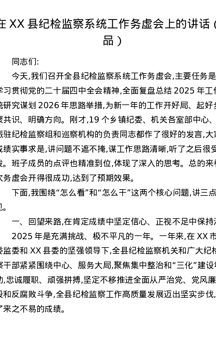在XX县纪检监察系统工作务虚会上的讲话