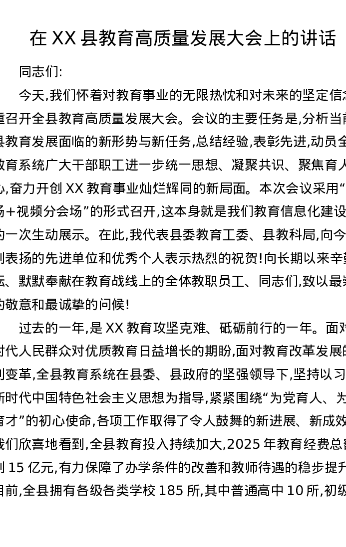 在XX县教育高质量发展大会上的讲话