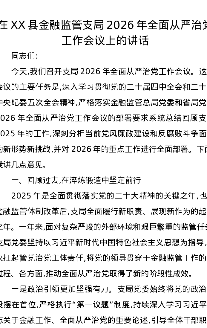 在XX县金融监管支局2026年全面从严治党工作会议上的讲话