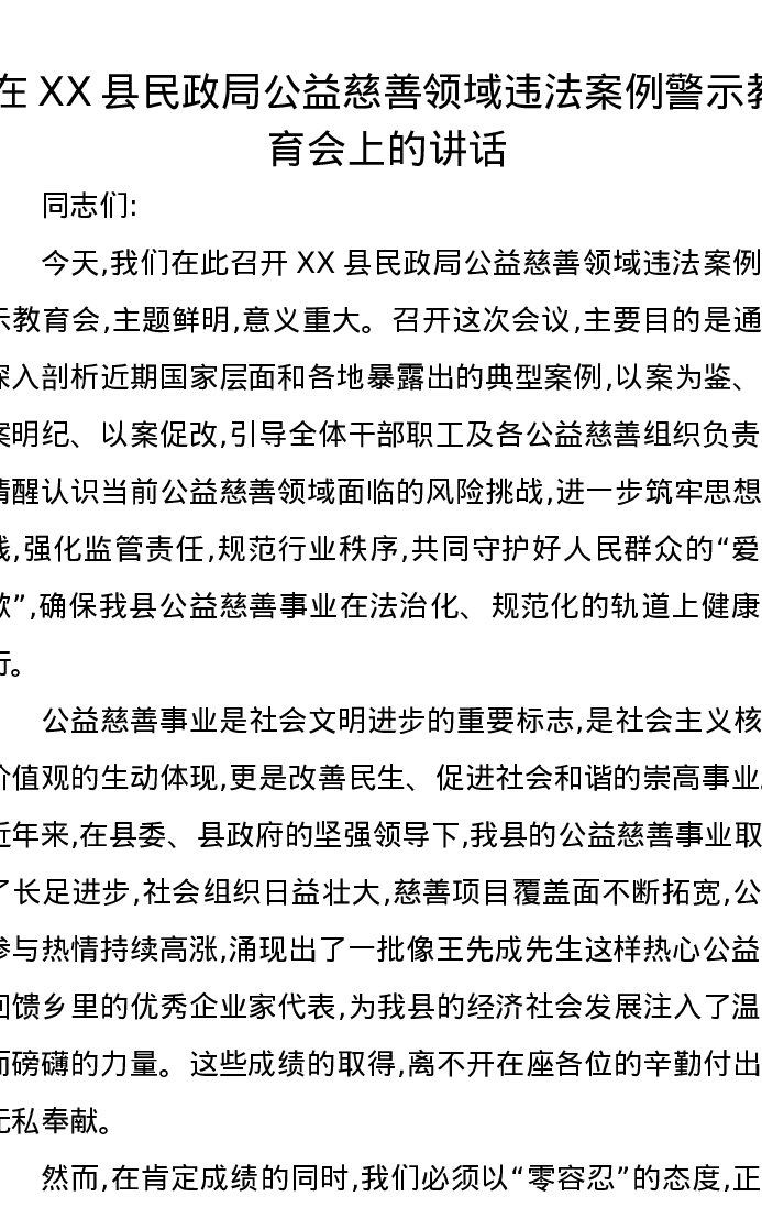 在XX县民政局公益慈善领域违法案例警示教育会上的讲话