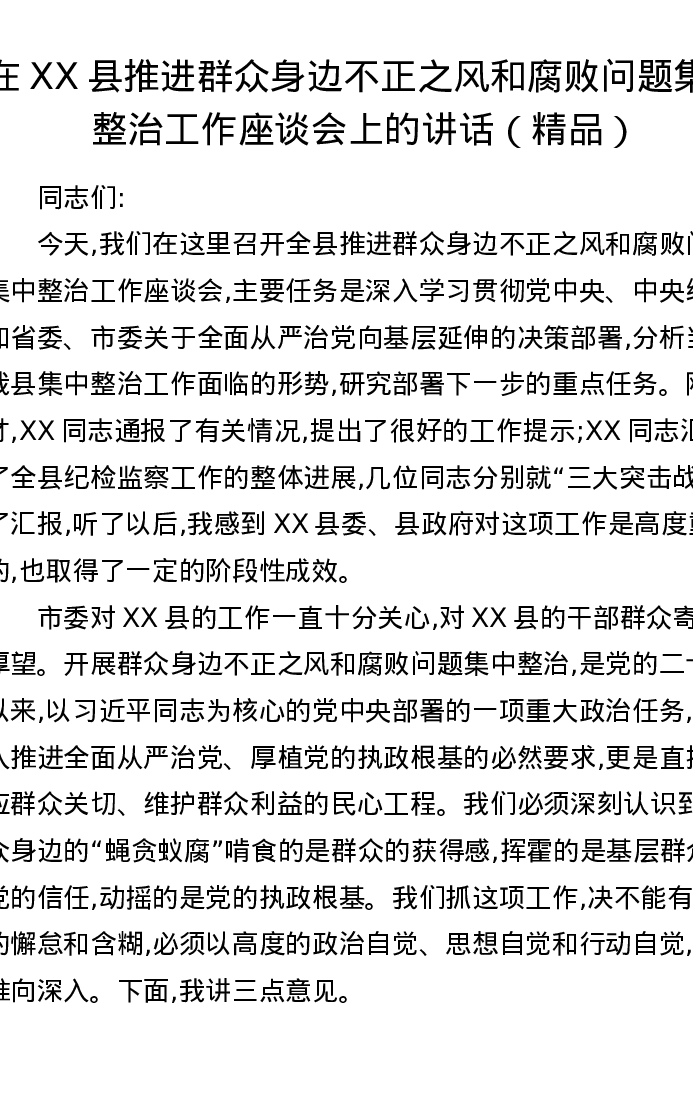 在XX县推进群众身边不正之风和腐败问题集中整治工作座谈会上的讲话